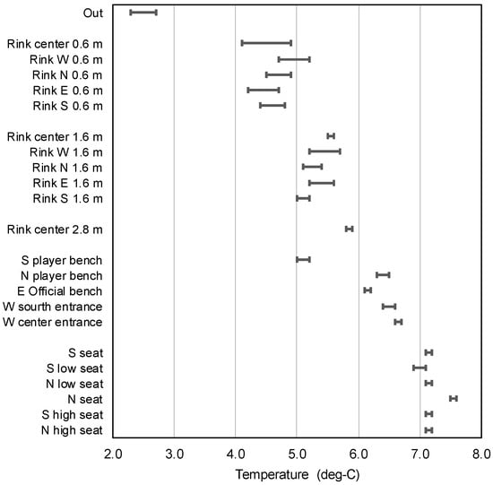 Figure 6 shows the temperature at the measurement points. There was about a two-degree temperature difference between the lower part (0.6 m above the ice rink) and the upper part (2.8 m above the ice rink). The temperature at the south player bench was almost the same as that as the middle part (1.6 m above the ice rink) but that of the north player bench was higher. The temperatures at the officials bench and the west entrances were relatively high, ranging from 6 °C to 7 °C, and those at the spectator seats were also relatively high, at over 7 °C.