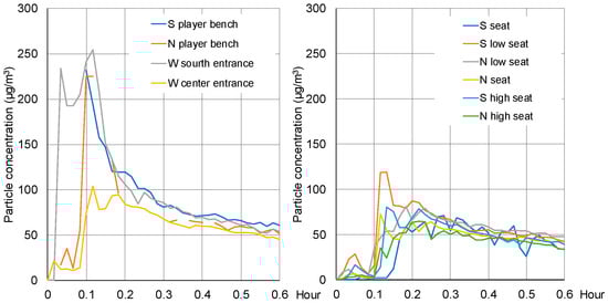 Figure 9 shows particle concentration for a one-period game by professional ice hockey players. In accordance with the smoke generation, the particle concentration was higher at the south entrance and at the player benches, and after that, the particle concentration at the central entrance became higher. At the spectator seats, it was confirmed that particles were flowing before the game. The peak of the particle concentration was seen after 0.1 h and the decline was seen after 0.2 h. Smoke generation was stopped, and a one-period game was played for 20 min from 0.27 h to 0.6 h.