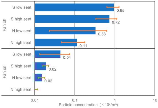 Figure 14 shows particle concentrations under fan off and on, indicateing the mean and standard deviation of concentration for 16 min after the smoke generation. The concentration values in the Figure are the total numbers of particle size from 1.0 μm to 10.0 μm. Similar to the particle visualization, fan off clearly had a higher particle concentration, especially on the south side. Fan on temporarily increased the particle concentration in the low seat on the south side, but overall values and variability of particle concentration were decreased.