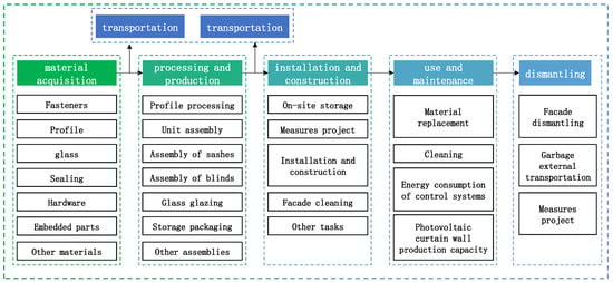 Currently, two main types of commonly used carbon accounting methods exist. The first one is the “bottom-up” model, which is based on process analysis and is also known as Life Cycle Assessment (LCA). It serves as the core theory for calculating and evaluating carbon emissions in the construction field. The second is the “up-bottom” model, which is based on input-output analysis and is mainly applicable to the economic sector. The LCA method has garnered recognition with several high-profile accounting standards. Examples include the first global accounting standard, the Greenhouse Gas Protocol, developed by the World Resources Institute (WRI), and the IPCC Guidelines for National Greenhouse Gas Inventories by the Intergovernmental Panel on Climate Change (IPCC). These standards have contributed to the formation of two widely influential life cycle assessment theoretical frameworks: SETAC and ISO. In recent years, many scholars have conducted research on the accounting and analysis of the complete lifecycle of carbon emissions of buildings using methods such as input-output analysis [,] or LCA [,,]. In 2019, China released the national standard GB/T 51366-2019 Standard for Calculation of Building Carbon Emissions [], which divides building carbon emissions into the operational stage, the construction and dismantling stage, and the building materials production and transportation stage. The standard specifies detailed calculation methods to guide carbon emission calculations in the construction sector. However, for non-structural components such as curtain walls, there are still many gaps in carbon emission calculations.