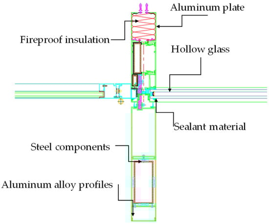 A specific aluminum-glass curtain wall is considered, comprising both framed and photovoltaic curtain walls. The building is designed to endure for 50 years. The area of the framed glass curtain wall is 8000 m2, with a designated service life of 25 years, while the photovoltaic curtain wall spans 1000 m2, similarly engineered for a 25-year period. The design drawing for the curtain wall section is shown in Figure 2.