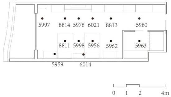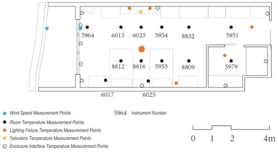 The main instruments’ measurement accuracy and range are detailed in Table 4. The measurement period was 24 h. Room 311 had 14 indoor temperature and humidity measurement points, 12 building envelope surface temperature points (including floor and ceiling), 6 lighting surface temperature points, and 1 TV surface temperature point. There was one outdoor balcony wind speed point and one indoor inlet wind speed point (Figure 10 and Figure 11). Room 313, as a control group, had 13 indoor temperature and humidity measurement points (Figure 12 and Figure 13). Room 309, as a control for studying the impact of layout on ventilation, had one balcony-to-indoor inlet wind speed point.