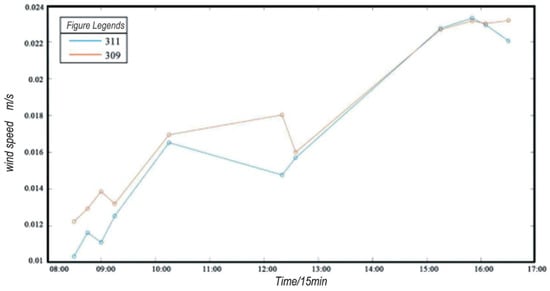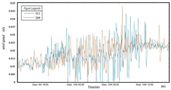 From 10 to 11 September, the SWEMA micro anemometer detected fluctuations in indoor inlet wind speed, indicating variations in instantaneous wind. Analysis of the average inlet wind speed fluctuations (Figure 14) revealed significant changes in natural wind speed. During the measurement process, the wind speed recorded by the handheld weather station placed on a semi-open balcony and the testo-425 anemometer showed little change, suggesting thermal pressure ventilation.