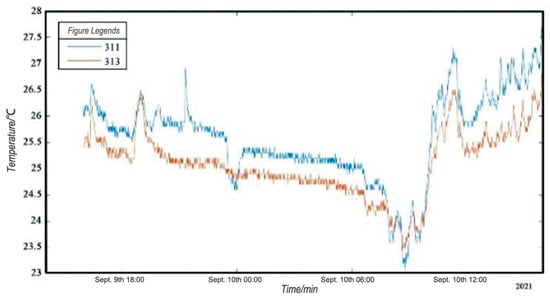 The indoor temperature measurements were largely as expected. A comparison of the central temperatures in rooms 311 and 313 (using simple averaging) clearly showed the impact of human activity on indoor temperature, leading to an increase (Figure 15).