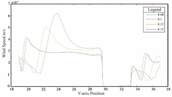 Through a series of simulations and adjustments, the specific parameters of the optimized design were determined: the living room dimensions were 8.64 m × 8.4 m, with axially symmetrical three-pane windows and the side windows measuring 1.2 m × 1.8 m to ensure the maximum effective opening area; the middle window measured 1.2 m × 1.2 m. If the living room design was semi-open, it was necessary to ensure that the air quality between the side windows did not deteriorate, with a partition wall height of 0.9 m. The south-side bedroom depth was 8.4 m, width 4.2 m; the north-side bedroom depth was 9.9 m, width also 4.2 m; bathrooms on both sides measured 1.6 m × 2.7 m. The exterior openings of the bedrooms were balcony doors measuring 1.6 m × 2 m, with a semi-open balcony design to ensure entrance wind speed (Figure 22).