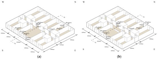These floor plans were simplified to include bedrooms (sleeping area, entrance area, bathroom, doors, and windows), traffic corridors, and open common living rooms (Figure 2). Based on the requirements of the current Chinese “Building Design Code for Elderly Care Facilities (GB50867-2013)” [] and combined with the survey and statistical results, the basic dimensions of two typical floor plans were determined (Table 2). Based on these typical plans, variable adjustments were made by modifying elements of the living spaces (Table 3) to explore methods for enhancing internal ventilation.