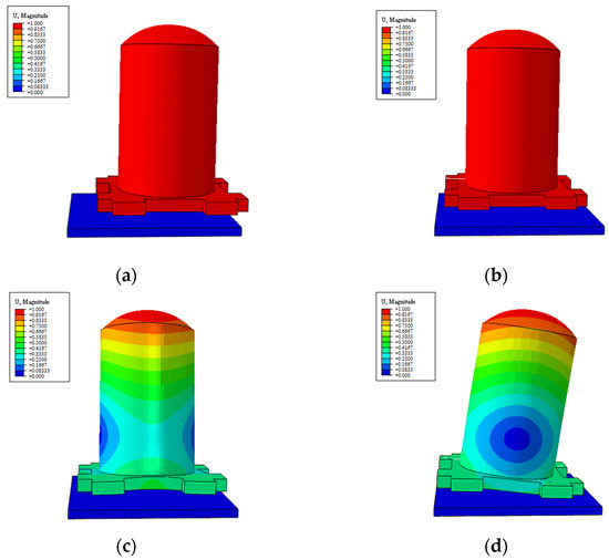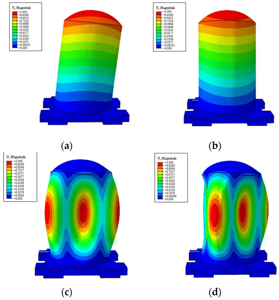 First to fourth order vibration modes of the safety shell structure model of a three-dimensional isolated nuclear power plant. (a) First vibration mode; (b) second vibration mode; (c) third order vibration mode; (d) fourth order vibration mode.