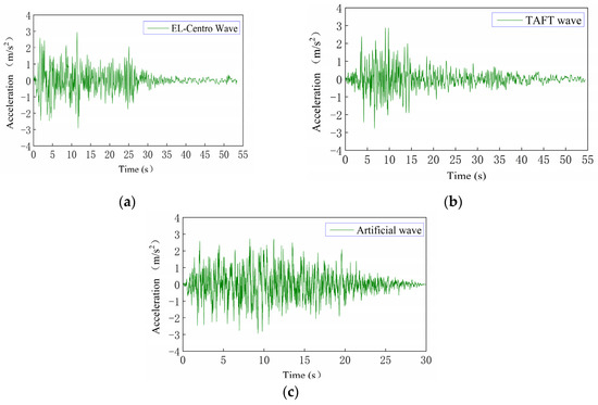 Earthquake ground motion acceleration time history. (a) EL-Centro wave; (b) Taft wave; (c) Artificial wave.