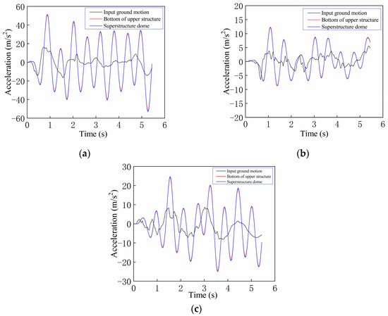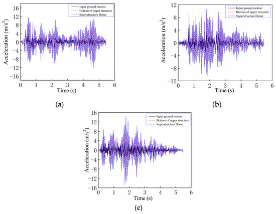Acceleration response of the X-direction structure under different earthquake ground motions. (a) EL-Centro wave, (b) Taft wave, (c) Artificial wave.