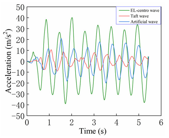 Acceleration response of the Z-direction structure under different earthquake ground motions. (a) EL-Centro wave, (b) Taft wave, (c) Artificial wave.