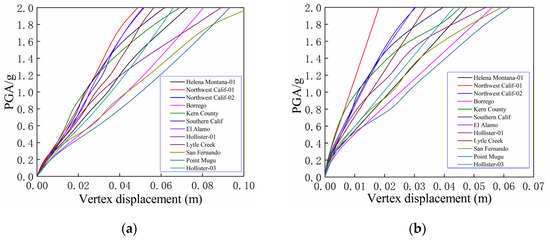 IDA curve cluster of the non-isolated and 3D isolated nuclear containment structure. (a) Non-isolated structure; (b) Three-dimensional seismic isolation structures.