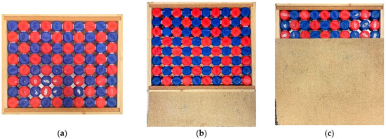 For the room conditioning study with the evaluation of the sound absorption, panels 0.5 m × 0.6 m in size in the form of a rectangular matrix with 10 × 8 caps and a wooden frame around the perimeter have been developed. The dimensions of these panels are adapted to the dimensional scaling of the features marked by the test surface according to [28]. A total of 10 configurations have been designed for the sound absorption study: 2 simple ones (H and F), 4 configurations with the layers of eco-sustainable materials shown in Table 1 placed on top of the flat configuration (Material-Flat) and 4 configurations with the layers of eco-sustainable materials shown in Table 1 placed on the bottom of the flat configuration (Flat–Material). These designs are listed in Table 3. Figure 3 shows images of 3 of these configurations by way of example.