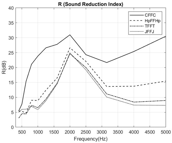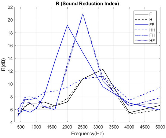 In order to study the behaviour of the panels made with plastic caps as a potential solution for acoustic insulation, regarding these panels as lightweight elements, tests are carried out in the small transmission chamber of the Higher Polytechnic School of Gandia of the Polytechnic University of Valencia. The tested configurations are those shown in Table 2. Figure 6 compares the sound reduction index (R(dB)) of the two single configurations (F, H) and the double configurations (FF, HH, FH and HF). We can observe that simple configurations F and H display the lowest sound reduction index values. The HH double configuration improves this value at low frequencies, although the configurations with the highest R(dB) values are the FF, FH and HF configurations. The FF configuration displays a highly pronounced resonance between 1500–2000 Hz; this resonance moves to higher frequencies (2000–2500 Hz) in the FH and HF configurations. Although it is not easy to explain the frequency position of these resonances, they may be due to the caps, and the move towards higher FH and HF frequencies set against FF may be due to a change in volume.