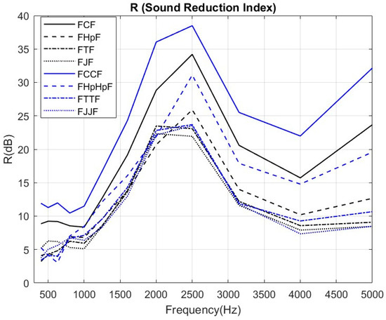 The simple F configuration and the double FF configuration are chosen for the design of the sandwich-type configurations. Figure 7 shows the results for the double material layer designs covering the flat panel (Material–Material–Flat). Figure 8 shows the results for the FF core configurations covered on both sides (Material–FF–Material). We can observe that, in the designs covered by a double layer of material, the highest sound reduction index values can be found in the cork board design, and the designs with hemp felt, textile waste and jute weaving display very similar airborne sound insulation values. In the frequency-dependent sound reduction index values shown in Figure 7, we can observe how the resonance displayed by the configurations without any material disappears. However, in the case of the FF core configurations covered with material on both sides (Figure 8), the resonance remains at 2000 Hz. The highest sound reduction index values continue to be those with the cork board design, and the designs with hemp felt, textile waste and jute weaving display very similar airborne sound insulation values.