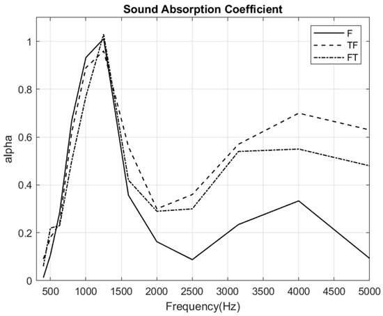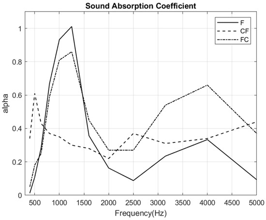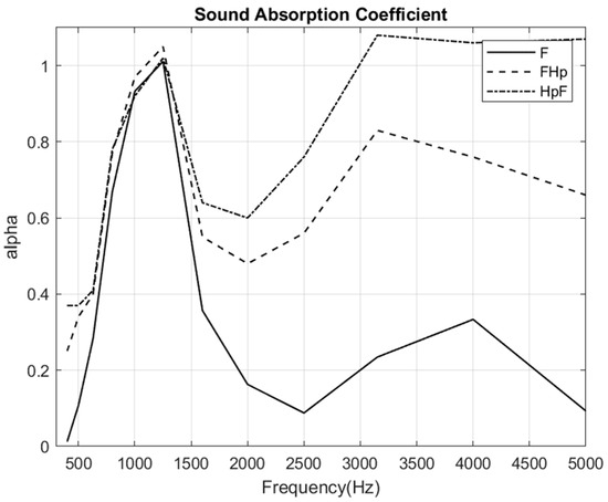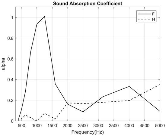 In order to study the behaviour of the panels made with plastic caps as a potential solution for acoustic conditioning, tests were carried out in the small reverberation chamber of the Higher Polytechnic School of Gandia of the Polytechnic University of Valencia. The tested configurations are those shown in Table 3. Figure 10 compares the sound absorption values for the flat (F) and hold (H) configurations. The panel made solely with the caps in the hold arrangement displayed a very low sound absorption value in the whole frequency range studied (400–5000 Hz); in practically the whole frequency spectrum it displayed values below 0.2. The panel with the flat configuration (F) did not display the same behaviour, with a highly pronounced resonance of around 1000 Hz and absorption values close to unity. We decided to continue studying the sound absorption by combining different layers of eco-sustainable materials (Table 1) with the flat configuration (F).