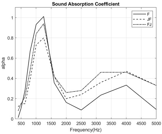 Sound absorption coefficient (500–5000 Hz) in small reverberation chamber. Configurations: Flat, Jute weaving–Flat and Flat–Jute weaving.