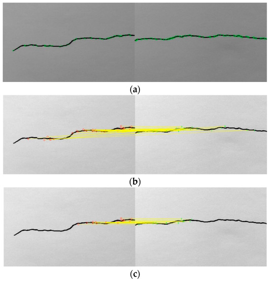A keypoint in the reference image is taken, and the Euclidean distance between it and any keypoint in the image to be registered is computed as the similarity determination metric between the keypoints in the two images. In this study, by comparing the distance between the nearest neighbor and the second nearest neighbor, all matches with a distance ratio greater than 0.6 were eliminated, as shown in Figure 2b. The RANSAC (Random Sample Consensus) algorithm can be used to eliminate the mismatched points, as shown in Figure 2c.