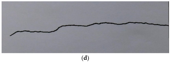 The manual measurement of crack parameters is shown in Figure 8. In manual crack width measurement, only a single point of the crack’s width can be assessed at a time, resulting in a labor-intensive process when measuring multiple points along the crack. To streamline this effort, we adopt the approach of using the plane crack width based on image processing as a representative value of the crack width in this experiment. This method allows for a more efficient and practical assessment.