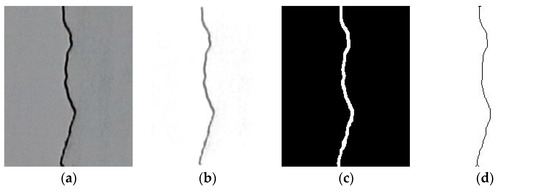 Crack image processing: (a) original image of crack; (b) image preprocessing; (c) image segmentation; and (d) skeletonization.
