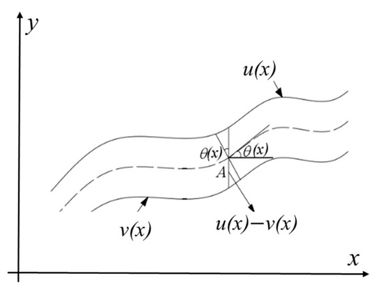In the calculation of crack width, “” and “” are two continuous functions to represent the upper and lower boundaries of the crack. The center point of the crack can be expressed as . Substitute the coordinates of point A into the crack center point equation and solve the derivative. represents the dip angle of the midpoint of the crack. The slope of the curve at point A can be expressed as follows: