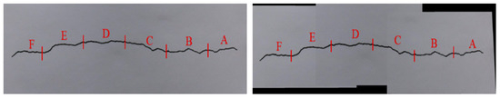 To further elucidate the impact and rationale of the image stitching method in enhancing the accuracy of surface crack detection results, a comparison was conducted between front-shot crack images and crack images stitched from three pictures. The crack is divided into six parts: A, B, C, D, E, and F, as shown in Figure 11.