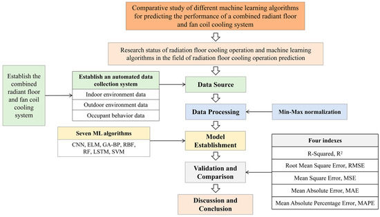 In recent years, various artificial intelligence algorithms have been proposed to describe and predict the operation behavior of air conditioning systems in buildings [27]. These algorithms employ different methods for the development of models. The development of machine learning (ML) models allows the efficient optimization of energy-efficient automation systems [28,29]. Li et al. [30] combined the Extreme Gradient Boost (XGBoost), CatBoost, and other novel gradient boosting algorithms with different optimization techniques in order to predict the electricity load using twenty years of historical data from a Turkish transmission company. Their results demonstrated that machine learning algorithms had high accuracy in energy consumption forecasting, showing very high predictive performance. Zhang et al. [31] developed an intelligent algorithm based on dynamic time entropy to conduct a case study in green building projects. Their results demonstrated the high applicability and accuracy of this algorithm. Su et al. [32] applied computational fluid dynamics to develop a geometric model and used an artificial neural network (ANN) to evaluate the condensation risk associated with a radiant floor cooling system. They also employed a back propagation (BP) neural network to estimate the required pre-dehumidification duration and the associated energy consumption. Their results showed that the ANN performs effective predictions, successfully averting the risk of condensation. Aparicio-Ruiz et al. [33] employed eight variables, including the indoor globe temperature, indoor air temperature, mean radiant temperature, and wind speed, in order to predict indoor thermal comfort in Mediterranean climates. They aimed to optimize thermal comfort while reducing energy consumption. Tang et al. [34] proposed a control framework for managing the indoor temperature of radiant ceiling cooling systems, leveraging a deep-reinforcement learning model. They also conducted a comparison with conventional control strategies. Their results showed that their proposed approach could achieve a 10.5% reduction in energy consumption. Yang et al. [35] proposed a multi-objective adaptive data-driven predictive control system that uses artificial neural network models for the prediction of indoor dynamics and thermal comfort. This approach allows the balancing of energy costs and thermal comfort. Hou et al. [36] developed an extreme learning machine model optimized using the grey wolf optimization algorithm in order to predict thermal comfort and CO2 concentration in air-conditioned rooms. Alaraj et al. [37] proposed a method for predicting and optimizing electricity consumption of the conditioning system of an office building for the next year using ML. Their results demonstrated that this model had a higher performance than existing traditional models. Pandey et al. [38] developed a deep neural network with three hidden layers to predict the window state of student dormitories and evaluate the energy losses associated with windows. Zhou et al. [39] applied the k-nearest neighbor, support vector classification, random forest, logistic regression, and extreme gradient boosting algorithms to predict the operation behavior of an open-space office air conditioning system. Their results demonstrated that all these algorithms have high performance. Peng et al. [40] optimized control strategies for air conditioning systems in different types of office buildings, resulting in a reduction of energy consumption in the range of 40–52% compared with conventional time-based scheduling systems. Liu et al. [41] proposed a fast method for predicting the cooling capacity of a radiant cooling floor. The method used CFD to develop a three-dimensional geometric model and employed a backpropagation neural network to learn and optimize operation behavior of the radiant cooling system. Mun et al. [42] applied support vector machines, random forest, and logistic regression algorithms to predict the operation behavior of air conditioning systems in residential buildings. Their results demonstrated that the random forest model outperforms the other two models.
