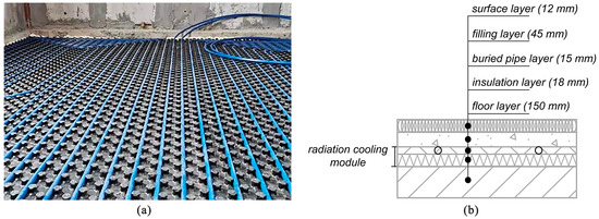 The radiant floor coil contained a dual-circuit configuration using dry-buried pipes, as shown in Figure 3a. The sequential assembly, from bottom to top, was composed of floor, insulation, buried pipe, and filling layers, each with a thickness of 150, 18, 15, and 45 mm, respectively, as well as a topping 12 mm surface layer, which included a decorative floor covering of the room and a leveling layer. A radiation cooling module was formed by integrating the insulation and buried pipe layers. The floor radiation heat exchange coil had an outer diameter, wall thickness, and spacing between coils of 12, 2, and 60 mm, respectively. It was constructed from polypropylene random copolymer. Figure 3b illustrates this basic structure.