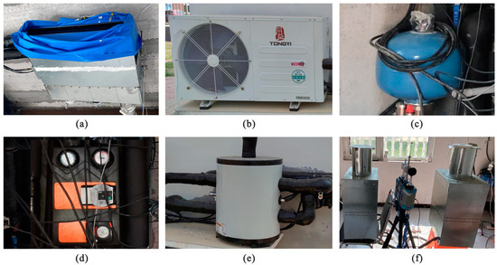 Equipment composition of the RFCFC system: (a) fan coil, (b) air source heat pump, (c) pressure regulating pipe, (d) mixing water pump, (e) thermostatic water tank, and (f) indoor heat source.