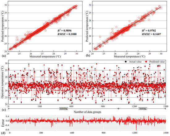 The Top prediction performances of the seven ML algorithms were compared using the robust Taylor diagram. The obtained results are shown in Figure 6. It could be seen that the results obtained by the models and the target variable were consistent. The proximity to the observed data, represented by the centered RMSE, served as a measure. A model can be considered the most optimal if it closely approximates the observed values, reflected by a high correlation value (approaching 1), a low RMSE, and a minimal variance. During the training stage, the RF algorithm outperformed the other models (e.g., CNN and SVM) in terms of the Top prediction, denoted by the high correlation value (>0.9869) and low RMSE (<0.1080). SVM ranked second, with a correlation value greater than 0.9694 and RMSE less than 0.1651. Figure 7a shows the predictions made by RF on the training set. Based on their predictive abilities, the models were ranked in the following order: RF > CNN > SVM > GA-BP > RBF > ELM > LSTM. In the process of prediction for testing phases, RF also outperformed the other models, exhibiting a high correlation value (>0.9702) and low RMSE (<0.1607). CNN ranked second, with a correlation value greater than 0.9528 and RMSE less than 0.1990. Figure 7b shows the prediction results obtained by SVM on the training set. The models were ranked based on their predictive ability as follows: RF > CNN > SVM > RBF > GA-BP > ELM > LSTM. It could be deduced from the comparative analysis of the two phases that the RF algorithm outperforms the other models. Figure 7c shows the prediction results obtained by the RF model on the training and testing results. Figure 7d presents the error curves during the training and testing processes. The error was mainly controlled within the range of −0.4–0.4. The maximum relative error was 2.87%, and most of the relative errors were less than 0.8%, which indicates a high accuracy.