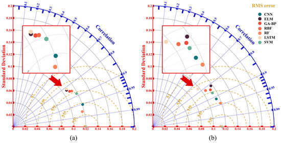 Taylor diagram to graphically represent Top predicting performance of CNN, ELM, GA-BP, RBF, RF, LSTM, and SVM models on (a) training and (b) testing data.