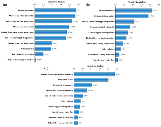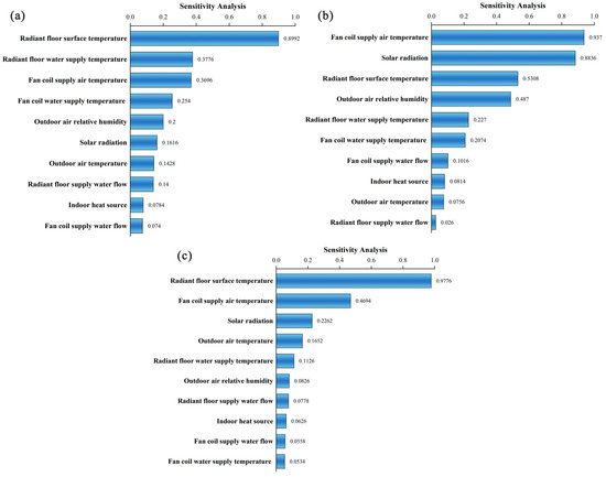 Several determinants affect indoor thermal comfort and system energy consumption, including climatic conditions, characteristics of the HVAC system, building attributes, and societal factors. In addition, the climatic variables—(i.e., temperature, relative humidity, precipitation, and solar radiation)—affect the indoor cooling load. In particular, when the temperature increases, the cooling load also gradually increases. The solar radiation significantly affects the cooling load. More precisely, it increases the indoor temperature and consequently increases the cooling load demand. Some other characteristics of the RFCFC system also have a significant effect, such as the supply/return water temperature, supply air temperature, and supply water flow rate. Building-related factors, including the envelope thermal performance, geographical location, functional use, insulation quality, and number of residences, also have an obvious effect. Social factors, including the population size, population growth rate, and lifestyle habits of the residents, may affect thermal comfort and system energy consumption. However, their impact is modest and thus it is often not accounted for in short-term forecasting. In addition, once a building is operational, the impact of its intrinsic factors on the cooling load is usually considered negligible.