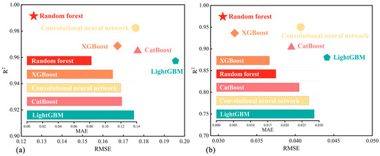 Figure 8 presents a graphical comparison between the prediction performances of Eh obtained by the ML algorithms on the training and testing sets, using the robust Taylor diagram. It could be seen that during the training phase, RF had the highest correlation (>0.9591) and the lowest RMSE (<0.0260), followed by CNN (correlation > 0.9180 and RMSE < 0.0375). The remaining five models had correlations less than 0.9 and RMSE values greater than 0.05. In addition, it could be clearly seen that RF and CNN had higher energy consumption prediction abilities compared to the other five algorithms. Figure 9a shows the prediction results obtained by RF on the training set. Based on their prediction accuracies, the ranking of the seven algorithms is as follows: RF > CNN > SVM > RBF > GA-BP > ELM > LSTM.