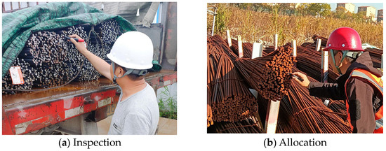The intelligentization of construction processes is an essential application of AI in construction and could help with saving time and costs. According to [5], a warehouse with RFID smart tags demonstrated time-saving of 81–99% in joint ordering and 100% time-saving in processing in warehouse management. The survey by [6] revealed that IoT could optimize space and help significantly reduce total storage costs by up to 16.84% with an average of 9.95%. In material management, counting primary building materials such as rebars for structures and steel pipes for scaffolding and shoring systems represents a critical link between process management and cost control. However, the current management of steel materials on construction sites still relies on manual counting methods such as inspection when delivering and allocation when constructing, as shown in Figure 1, which is inefficient, costly, and unautomated. Therefore, it is necessary to develop intelligent counting methods to solve these challenges and promote intelligent material management.