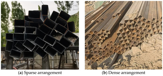 The core concept of the above image-processing-based counting methods has been to segment each bar in the image. These approaches have strict requirements in terms of the lighting conditions, material section, and background. However, images captured on construction sites often include various interference factors, such as uneven indentations, oxidation, corrosion, occlusions on bar ends, and nonuniform lighting, that make image-processing-based methods impractical. Additionally, little research has been conducted on counting square steel tubes because the human process of stacking square tubes sometimes results in random rotation, which makes image processing for them more challenging than that for rebars and pipes. Figure 2 shows the random rotation of square tubes in sparse and dense arrangement scenarios.