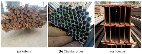 To further promote the development and evaluation of intelligent counting methods, datasets of other steel materials such as rebars, circular pipes, and I-beams were also established in this study. Figure 4 shows several representative images of these steel materials with annotations. Images of rebars and circular pipes were manually annotated with rectangular ground-truth bounding boxes, and images of I-beams were annotated with polygon ground-truth bounding boxes.