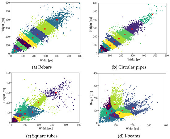 Anchor boxes are conducive to accelerating model training and improving detection accuracy. k-means clustering was applied to obtain anchor boxes of each type of steel material using ground-truth boxes in the corresponding dataset. The results are shown in Table 1 and Figure 5. Data points with the same color belong to the same cluster, and the red stars represent anchor boxes.
