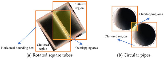 As mentioned in Section 2.1, the random rotation of square tubes may cause shape orientation changes, making them difficult to detect. Figure 6 shows the differences between square tube detection and circular pipe detection: the overlapping areas and cluttered regions of bounding boxes of square tubes are larger than those of circular pipes. Larger overlapping areas result in the abandonment of certain objects after non-maximum suppression. Furthermore, cluttered regions introduce a great deal of noise, causing interference or even the disappearance of image information features.