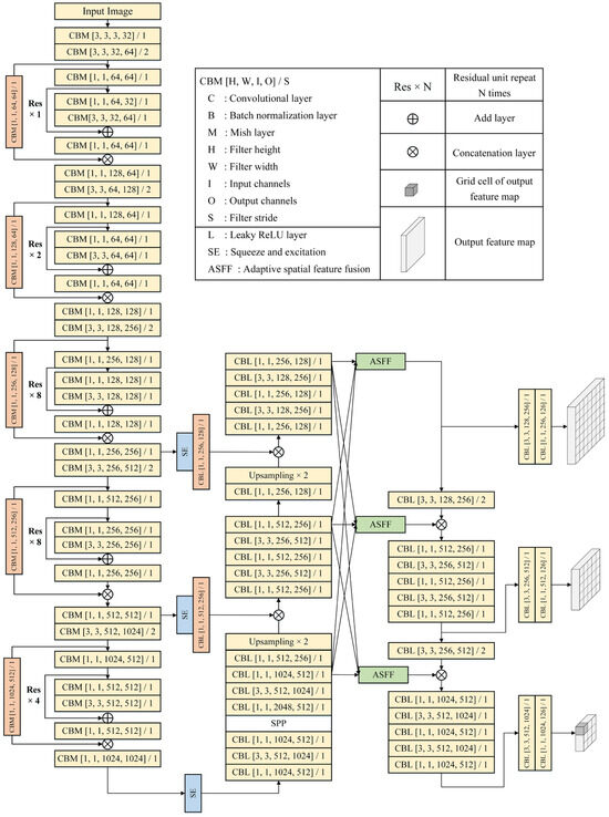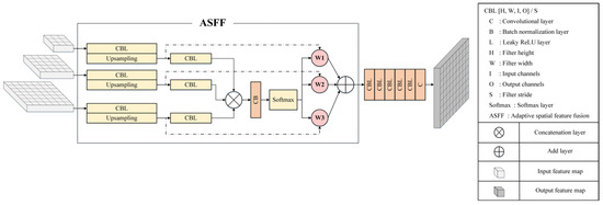 For object detection tasks in computer vision, once an object is associated with a specific feature map, the corresponding positions in other feature maps are considered the background. This leads to conflicts and interference during feature extraction, reducing the effectiveness of the model. To address this issue, an attention mechanism is typically applied to focus the network on essential features, thereby improving model accuracy. Adaptive spatial feature fusion (ASFF) [30] can fuse feature maps of different resolutions into a fixed-resolution feature map, reducing the inconsistency between differently scaled features caused by the correlation between large objects and low-resolution feature maps, as well as between small objects and high-resolution feature maps. Therefore, ASFF was adopted in this study to directly select and combine effective information from different resolutions, thereby enhancing model performance. The performance of different attention mechanisms was compared through experiments. The model performed best using the squeeze and excitation (SE) module [31] in combination with ASFF. The final overall network architecture is shown in Figure 7, the SE model is depicted in Figure 8, and the ASFF is described in Figure 9.