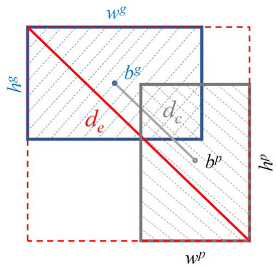 where LCIoU represents the CIoU loss; bp and bg represent the center points of the predicted bounding box (the gray shaded area) and the ground-truth box (the blue shaded area), respectively; dc represents the distance between bp and bg; de represents the diagonal length of the smallest box (the red dotted rectangle) enclosing the two boxes; v represents the consistency of the aspect ratio; and (wg, hg) and (wp, hp) represent the (width, height) of the predicted bounding box and ground-truth box, respectively, as shown in Figure 10.