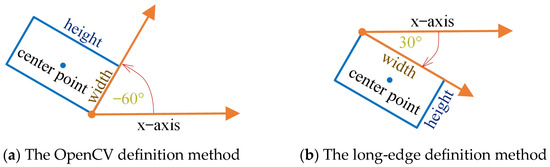 As the CIoU loss function does not include angle information, to perform regression on rotated bounding boxes, the angle of the rotation must be defined and applied using a new localization loss function. In a two-dimensional Cartesian coordinate system, rotated rectangular bounding boxes are typically defined by the OpenCV definition method or the long-edge definition method [33]. The OpenCV definition method defines the edge that forms an acute angle with the x-axis as the box width with an angle range of [−90°, 0°], as shown in Figure 11a. The long-edge definition method defines the longer edge as the box width, with an angle range of [−90°, 90°], as shown in Figure 11b. As the descriptions of parameters in the long-edge definition method are clearer than those in the OpenCV definition method, the long-edge definition method was adopted in this study.
