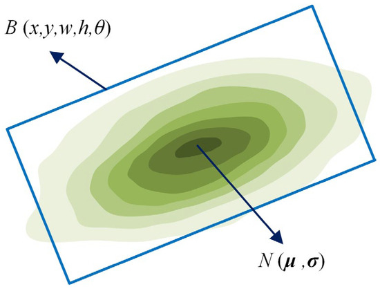 The localization loss function was used to measure the difference between the predicted bounding box and the ground-truth box. In this specific implementation, the parameters of the rotated bounding box were converted into Gaussian distribution features comprising the mean and variance. The Kullback–Leibler (KL) divergence [34] and Gaussian Wasserstein Distance (GWD) [35] were used to quantify the difference between the two two-dimensional Gaussian distributions as the localization loss in the proposed counting model. As shown in Figure 12, the defined parameters of the rotated bounding box can be converted into Gaussian distribution features as follows:
