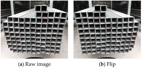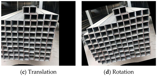 The purpose of data augmentation is to enhance the original image and enrich the training dataset, making the resulting model more robust for different images. Geometric and photometric distortions are two commonly used augmentations. The flip, translation, and rotation are used in geometric distortions. The brightness, contrast, and saturation are used in photometric distortions. Figure 13 shows the augmentation effect of geometric distortions. Because the number of collected images of square tubes in this study was limited, and such objects can be placed at various angles in actual scenarios, rotation was applied for data augmentation to help the model learn to detect square tubes at many different angles using only limited data, thereby improving its generalization ability. In this study, random geometric transformations were applied to half the images in the dataset before model training, followed by random photometric transformations.