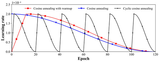 where ηmax and ηmin represent the maximum and minimum values of the learning rate, respectively; ηt is the learning rate of the current epoch; Tcur represents the current epoch of the training phase; Twarm represents the total epochs of the warmup phase; and Ttotal represents the total epochs of the training phase. In this study, the maximum and minimum learning rates were set to 0.0002 and 0, respectively. The total training epoch was set to 120. When using cosine annealing with warmup, the epochs of the warmup and cosine annealing were set to 12 and 108, respectively. The Adam optimizer was applied to update parameters. The batch size was set to six, and the Mish function was adopted in the activation layer. Figure 14 depicts the evolution of the learning rate over time using different learning rate schedules.