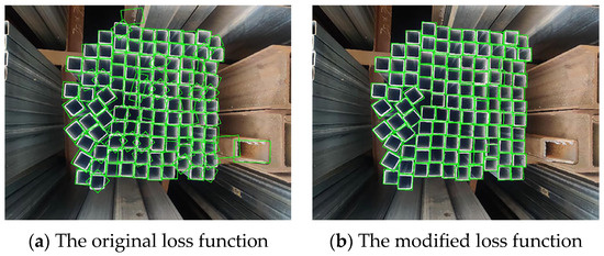 When the model adopted the SE attention mechanism (Figure 8), with ASFF (Figure 9) with GWD as the loss function, the highest AP value was 91.41%, and the MAE value was 4.07. These results indicate that the proposed improvements to the original YOLOv4 model presented in this study were highly effective. The detection results with and without the improved loss function are compared in Figure 15, which shows that false detections and significant errors in the sizes and angles of the detection boxes occurred before the loss function was changed.
