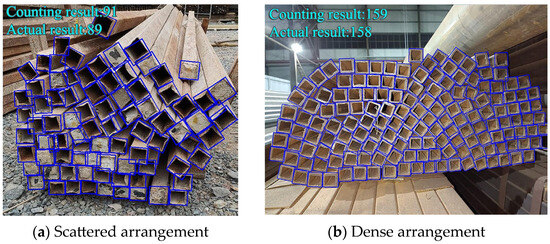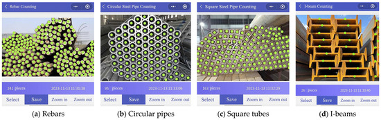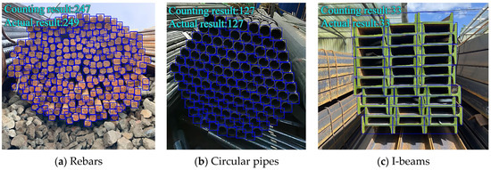 The approach used to establish the square tube counting model can be directly extended to rebars, circular pipes, and I-beams. As real-time counting models for individual material types have been developed separately [46,47], the modeling process is not described in detail in this paper. Examples of counting results are shown in Figure 17.