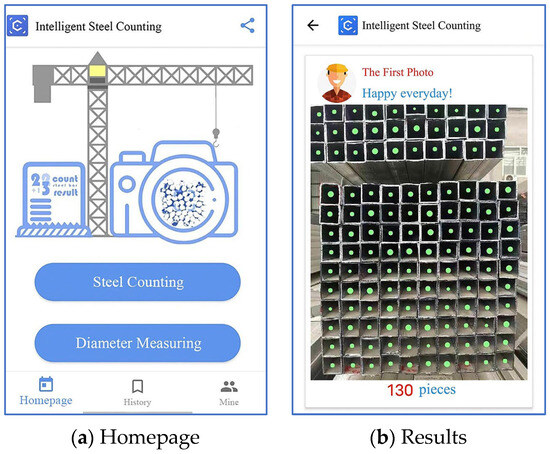 An “Intelligent Steel Counting” smartphone application was developed to practically apply the proposed counting method and address problems encountered on actual construction sites. Users of this application need only download it from a mobile application store and register to use it. The application homepage and an example of the counting results provided by the application are shown in Figure 18.