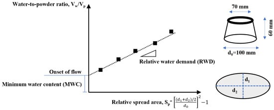 The flow characteristics of the paste mixtures made with various binder systems were evaluated using the mini-slump cone based on the method detailed in [22]. This test can be used to determine the effect of CC and LF content as well as their combinations on packing density and robustness, and the test procedure is illustrated in Figure 1. The relative spread area of the slump flow linearly increases with the water-to-powder volume ratio (Vw/Vp) of the paste mixture. The intercept of the relation refers to the minimum water content (MWC) necessary to start the flow, and the slope represents the relative water demand (RWD) that reflects the flow’s sensitivity to changes in water content. Assume that no air is entrapped in the paste mixtures; a low MWC indicates high packing density, while a high RWD indicates high robustness. The paste mixtures were formulated with incremental Vw/Vp varying from 1.1 to 1.5. A constant superplasticizer (SP) dosage of 0.1% by mass of the binder was added to secure the complete dispersion of binder particles, corresponding to the saturation point for the binder systems [23].