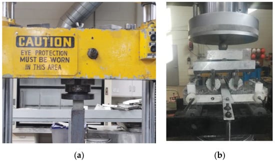 Testing setup for measuring hardened properties: (a) compression test; (b) third-point loading test.