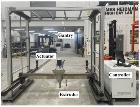 Inline printing via an extrusion-based 3D printer was used to evaluate the printability of the fiber-reinforced mortar mixtures. The screw-type printer is illustrated in Figure 4. An extruder mounted with an augur and nozzle was installed on a gantry frame measuring 1.5 × 1.5 × 1.5 m3. Guided by a controller, the three-axis movement of the extruder, powered by an actuator, was meticulously configured to fabricate the designed printing objects. For the X, Y, and Z axes, the moving speed of the extruded was customized at 50 mm/s, 50 mm/s, and 5 mm/s, respectively. A circular 30-mm nozzle was selected, and the rotational speed of the augur was set at 0.8 rounds per second constantly during extrusion.