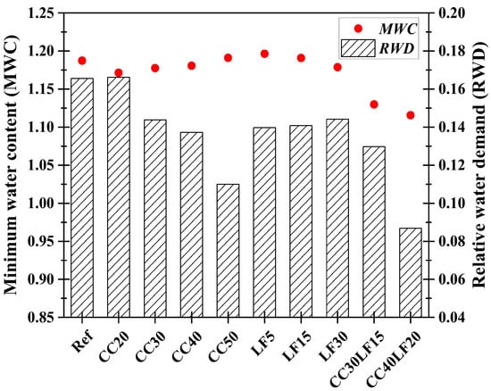 The LF addition led to a slight increase in MWC but a drop in RWD. With the increase in the LF replacement, the MWC decreased while the RWD slightly increased. Due to the micro-filling effect induced by the ultrafine LF, the entrapped water inside the granular skeleton of cement particles could be released and filled by the LF [28]. On the other hand, the MWC and RWD significantly decreased when the CC and LF were combined, most notably in the CC40LF20 mixture with the lowest MWC and RWD values, which were reduced by 6% and 48%, respectively, compared to the reference paste.